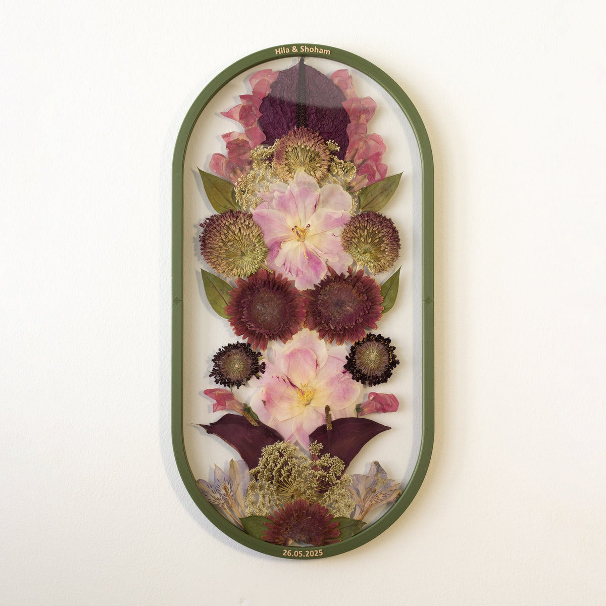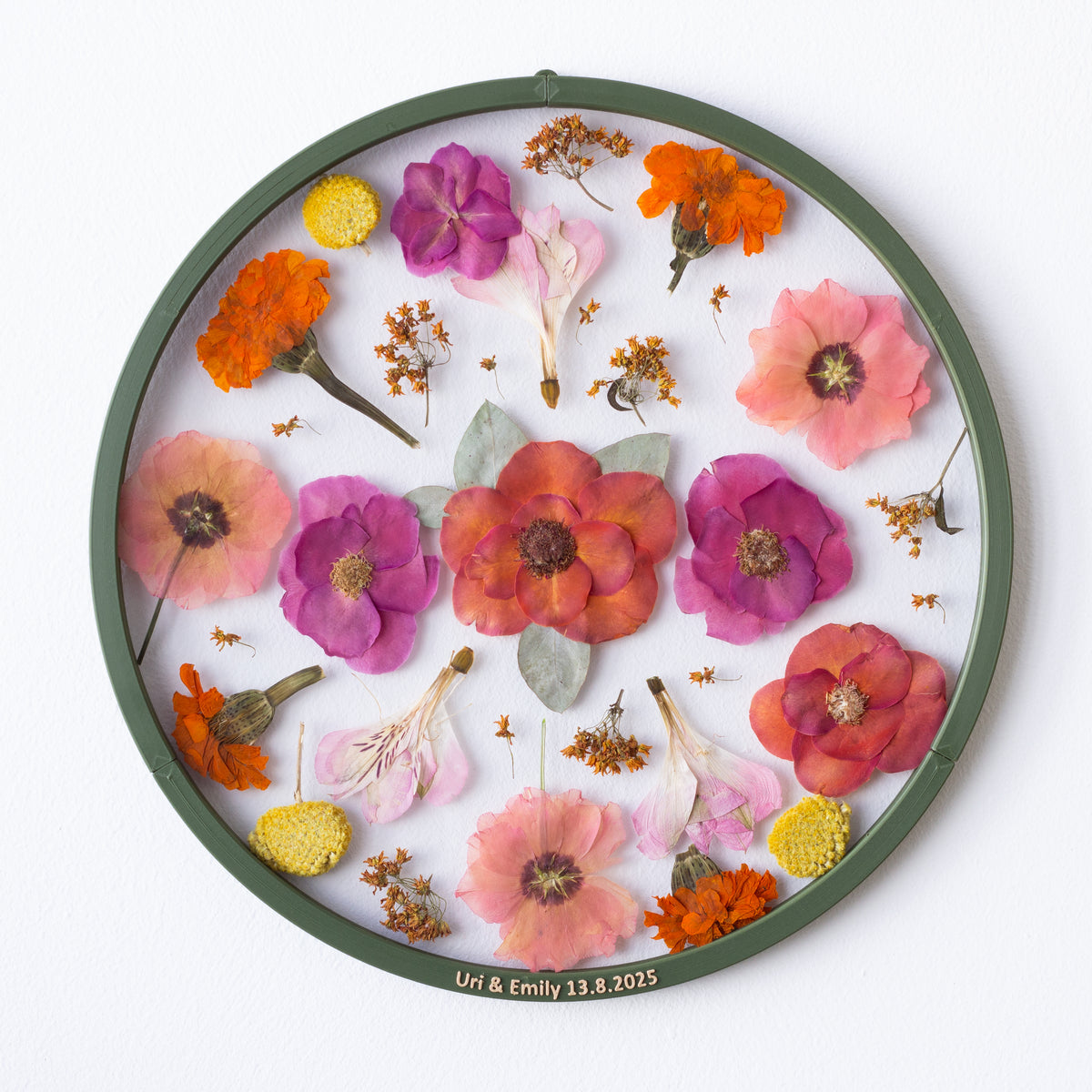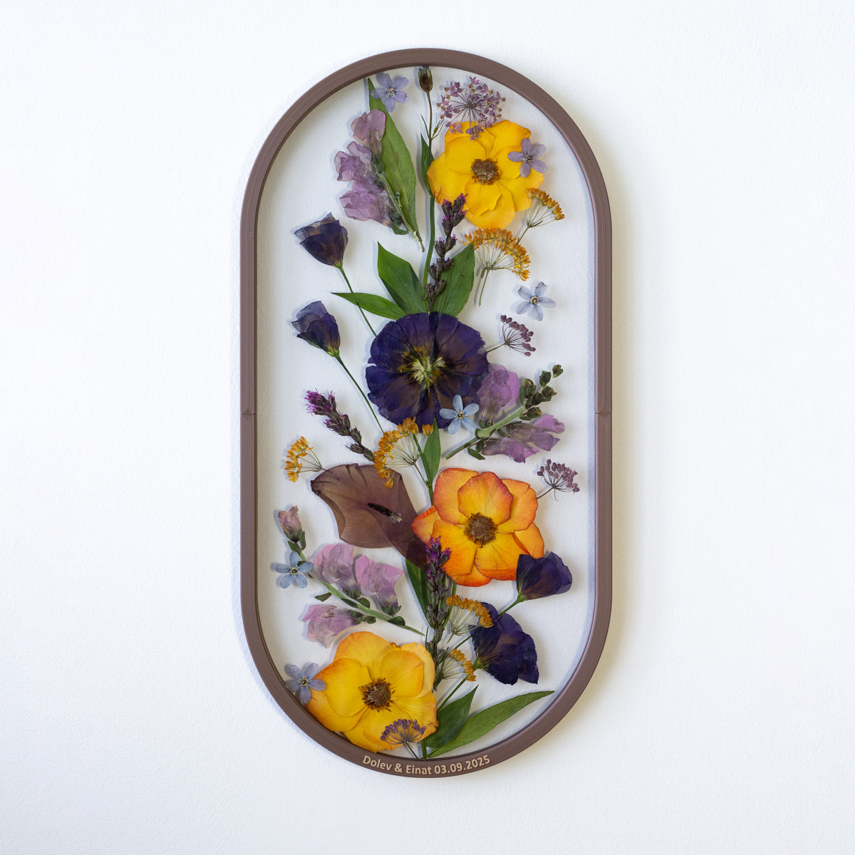 אנו משלימים את היצירה בייצור מסגרת מעץ או בהדפסת תלת-ממד (ניתן לבחור מתוך 6 צבעים המותאמים לעיצוב), ומשלבים בה אלמנטים אישיים כמו שברי כוס, שמות ותאריך. היצירה נארזת ונשלחת אלייך כזיכרון חי ומרגש מהיום שלכם.