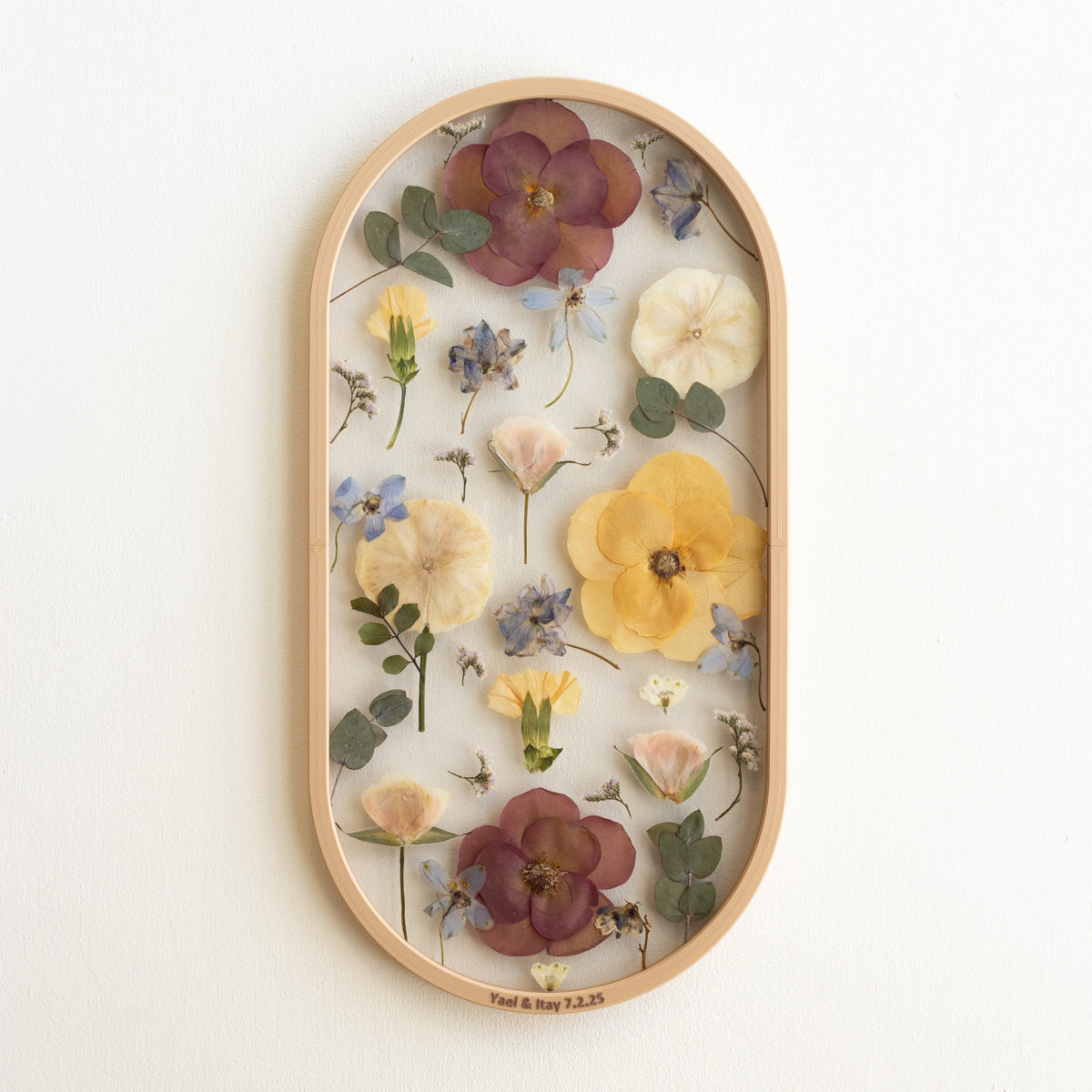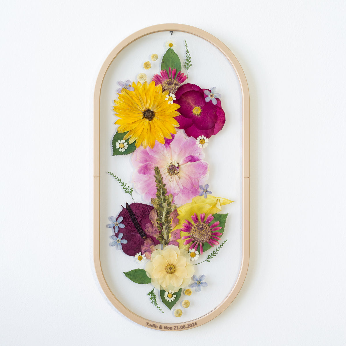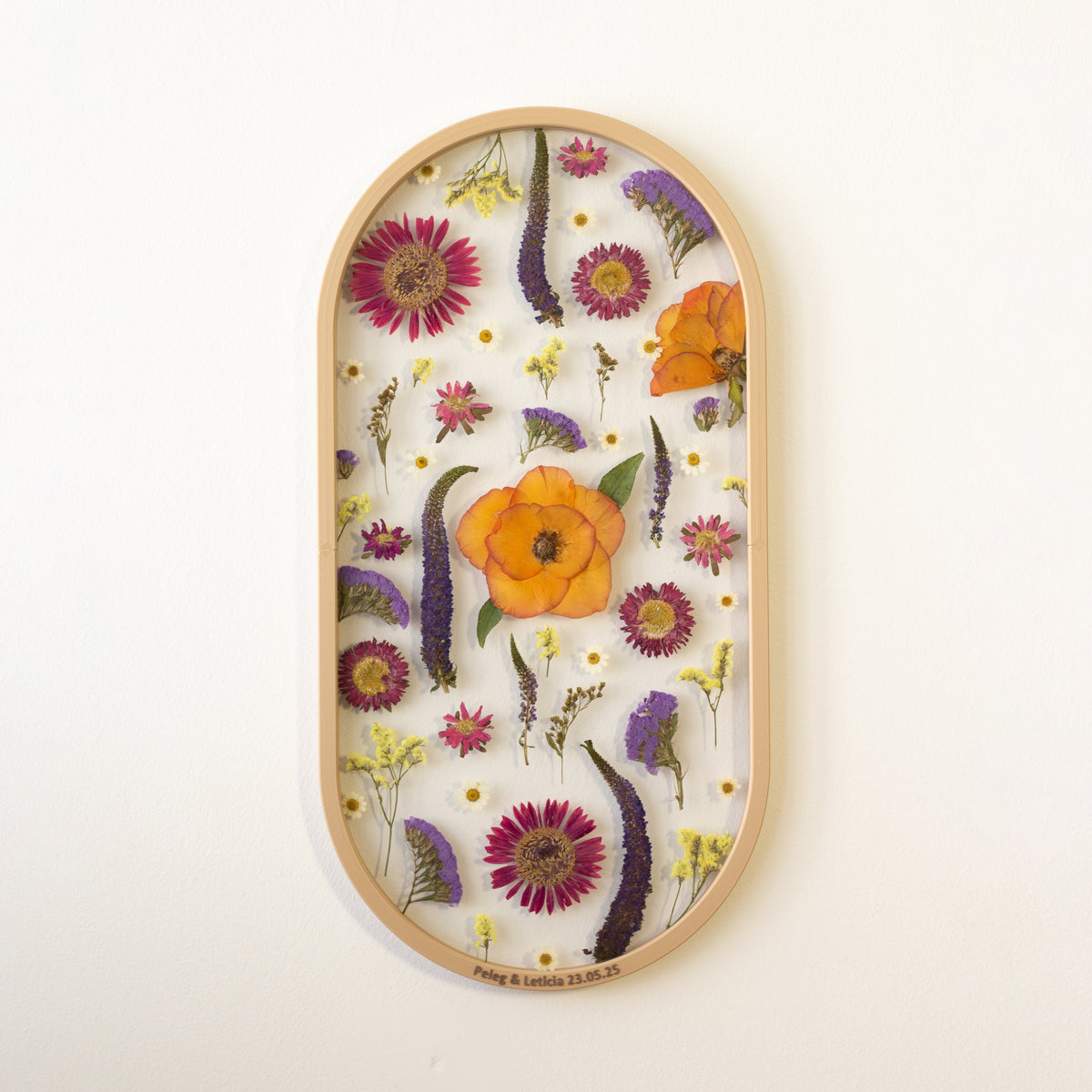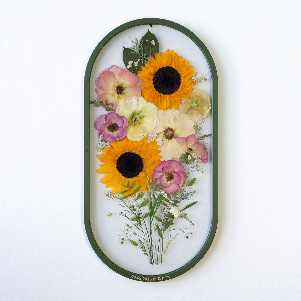 אנו משלימים את היצירה בייצור מסגרת מעץ או בהדפסת תלת-ממד (ניתן לבחור מתוך 6 צבעים המותאמים לעיצוב), ומשלבים בה אלמנטים אישיים כמו שברי כוס, שמות ותאריך. היצירה נארזת ונשלחת אלייך כזיכרון חי ומרגש מהיום שלכם.