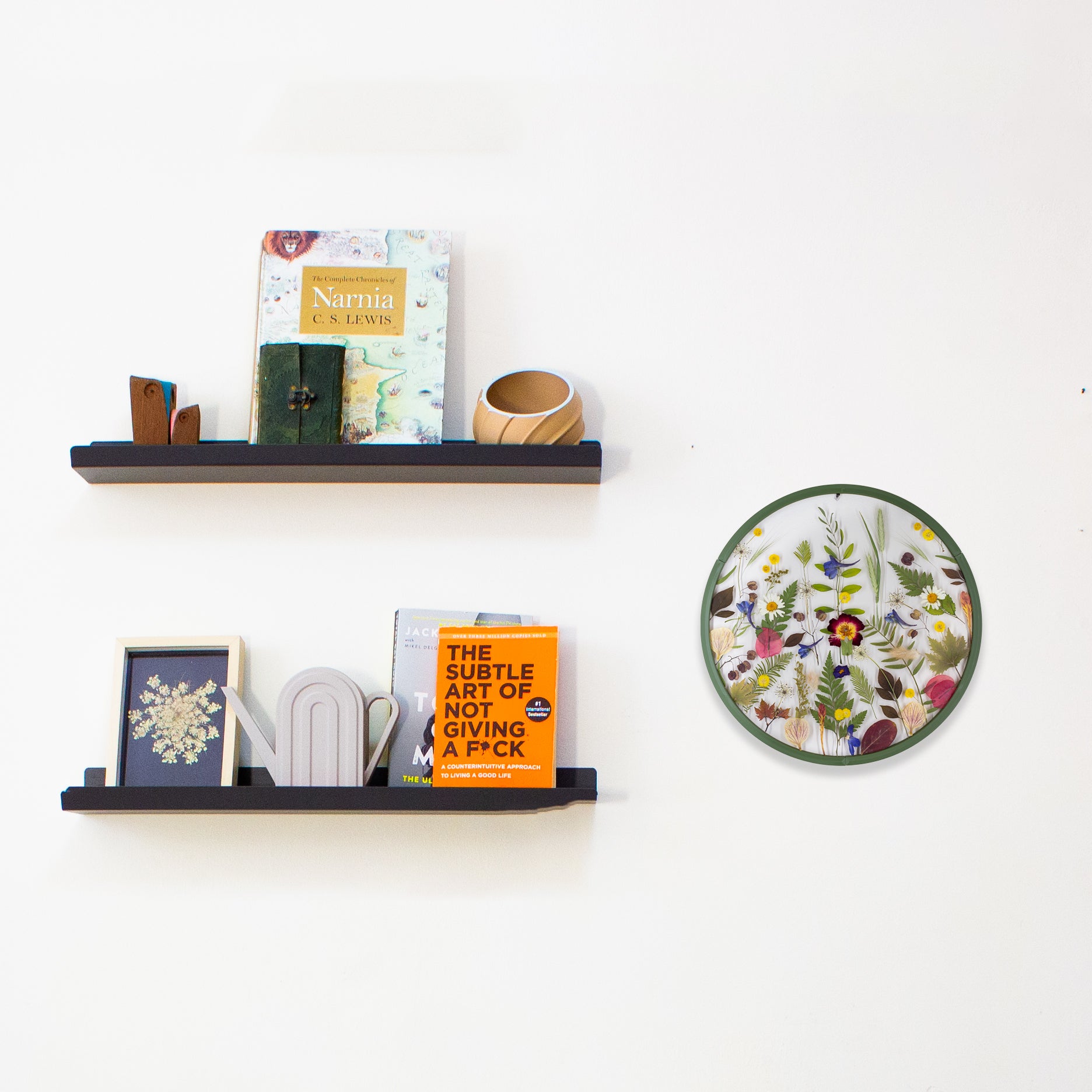 מסגרת עגולה גדולה בצבע ירוק זית, בהדפסת תלת מימד, בשילוב פרחי שדה צבעוניים ומגוון ירוקים.